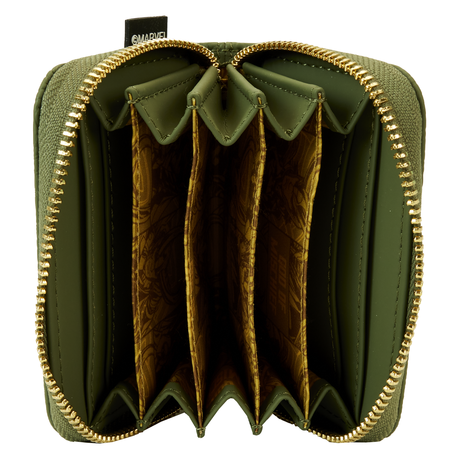 The Loungefly COLLECTIV Marvel Loki The ORGANIZR Accordion Wallet is made of vegan leather (polyurethane). Wallet zips closed and has sturdy gold-colored metal hardware. Additional features include printed, debossed, silicone, and metal rivet details. Take note of the coordinating inside lining.