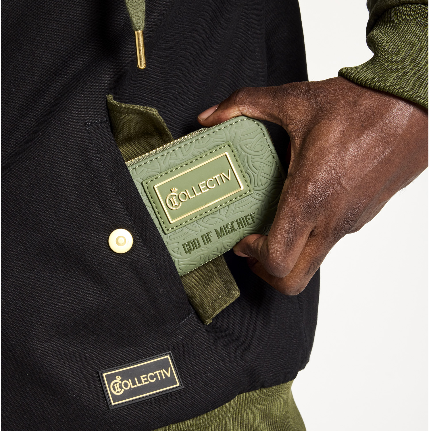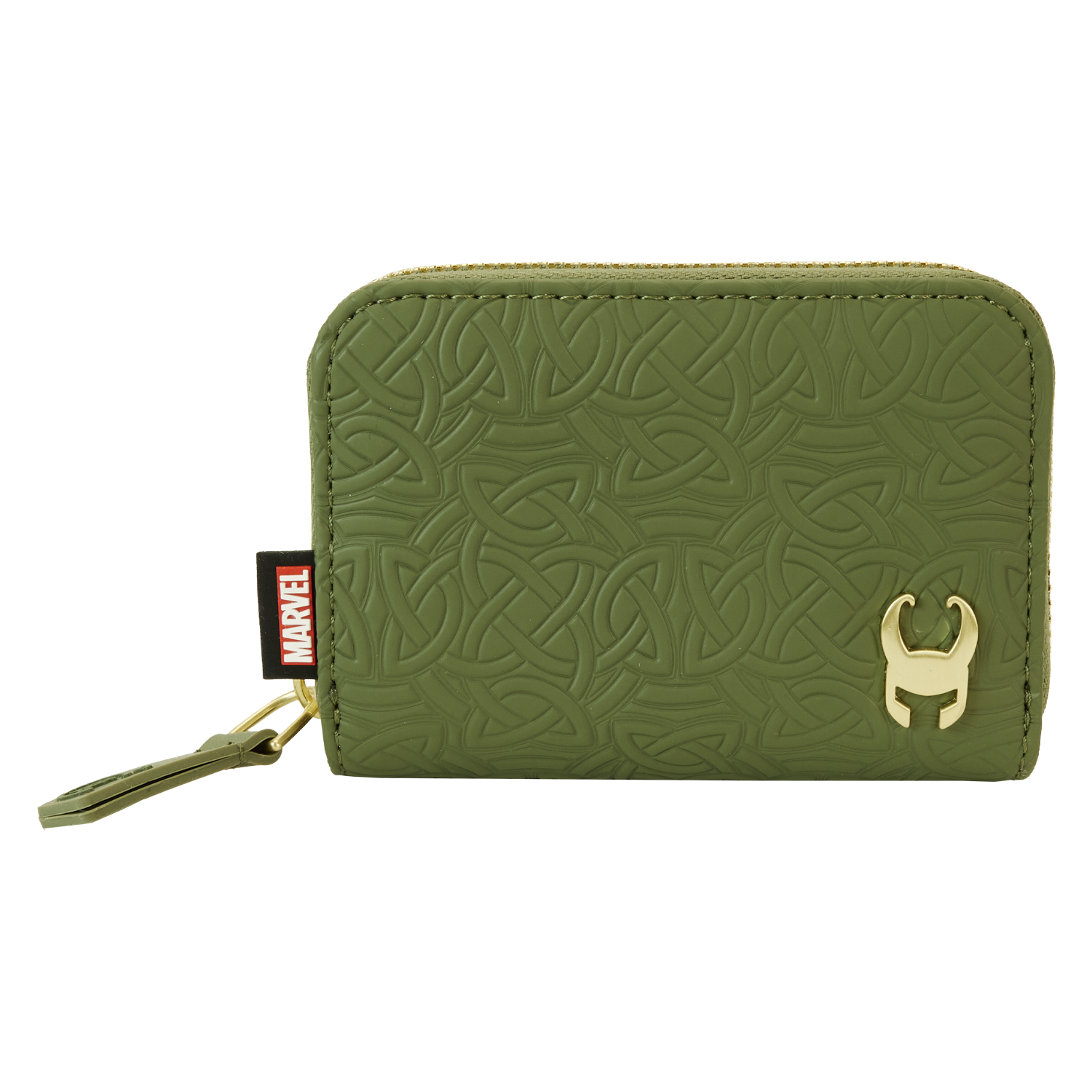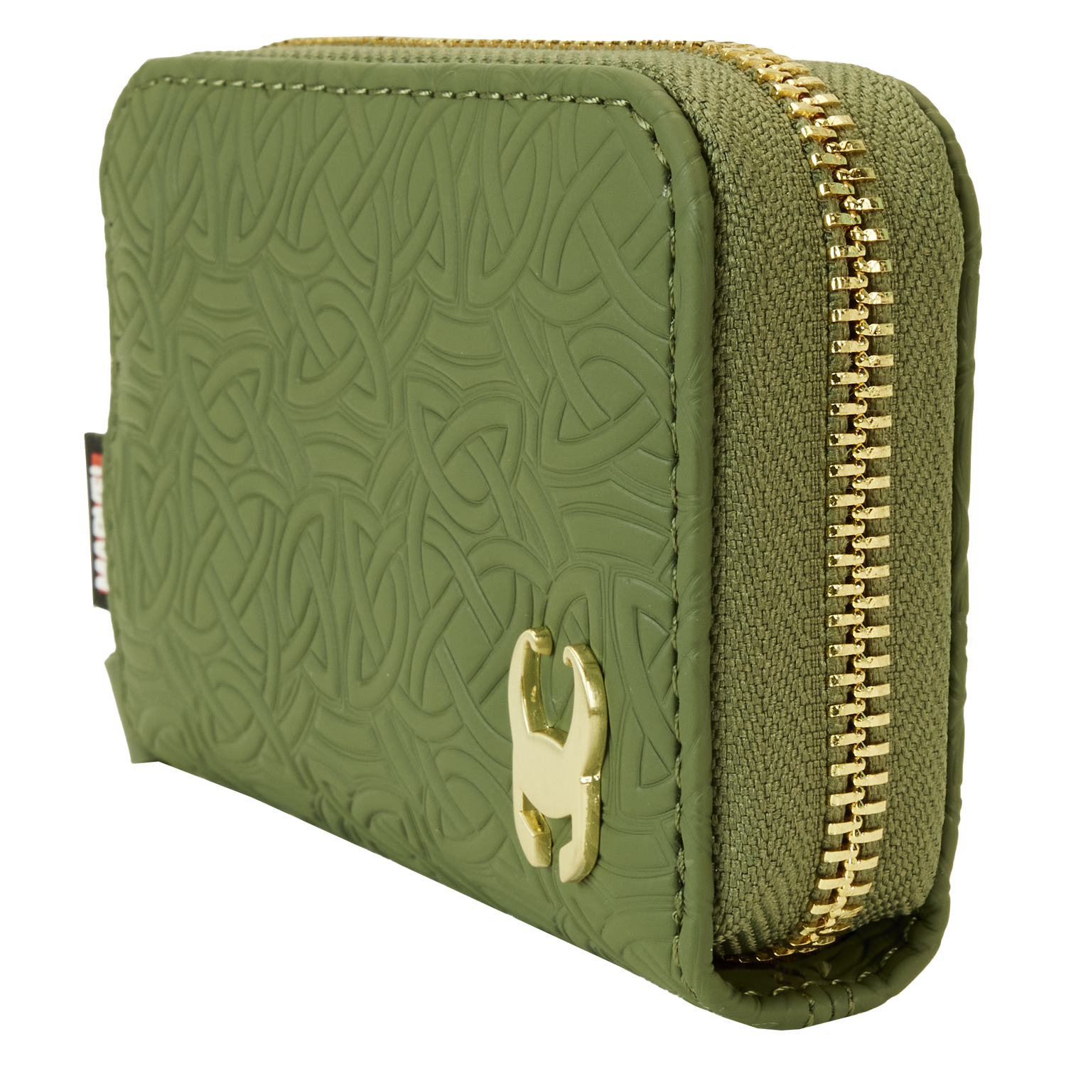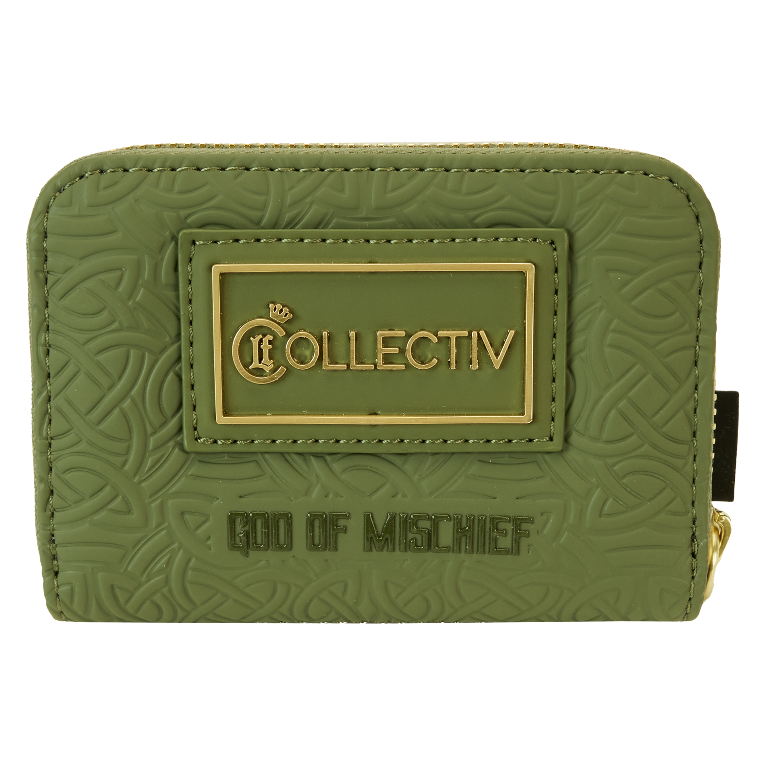 Slip away with a timeless look. The Loungefly COLLECTIV Marvel Loki The ORGANIZR Accordion Wallet offers a sleek travel option on any timeline. If you crave organization, this wallet holds your essentials in a neat, orderly fashion, while you celebrate your favorite fandom. A subtle green background serves as a canvas where intricate debossed patterns of Loki’s intertwining snake symbol repeat. A gold metal rivet adds an elegant touch, and on the back, raised silicone print spells out “God of Mischief.”