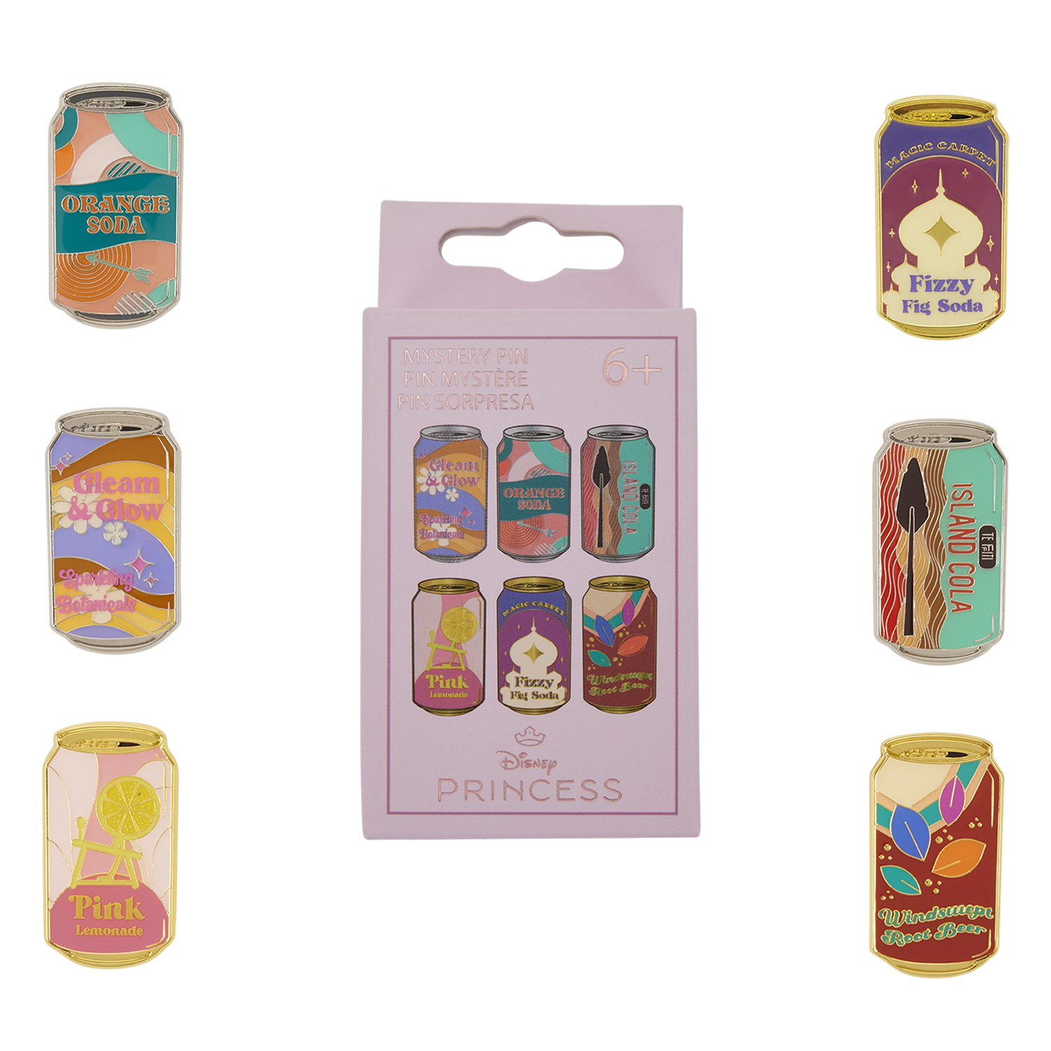 Each pin looks like a can of soda, with the branding coordinating to a different Disney Princess. There are six in total to collect: Rapunzel's "Gleam & Glow," Merida's "Orange Soda," Moana's "Island Cola," Aurora's "Pink Lemonade," Pocahontas' "Windswept Root Beer," and Jasmine's "Magic Carpet Fizzy Fig Soda."