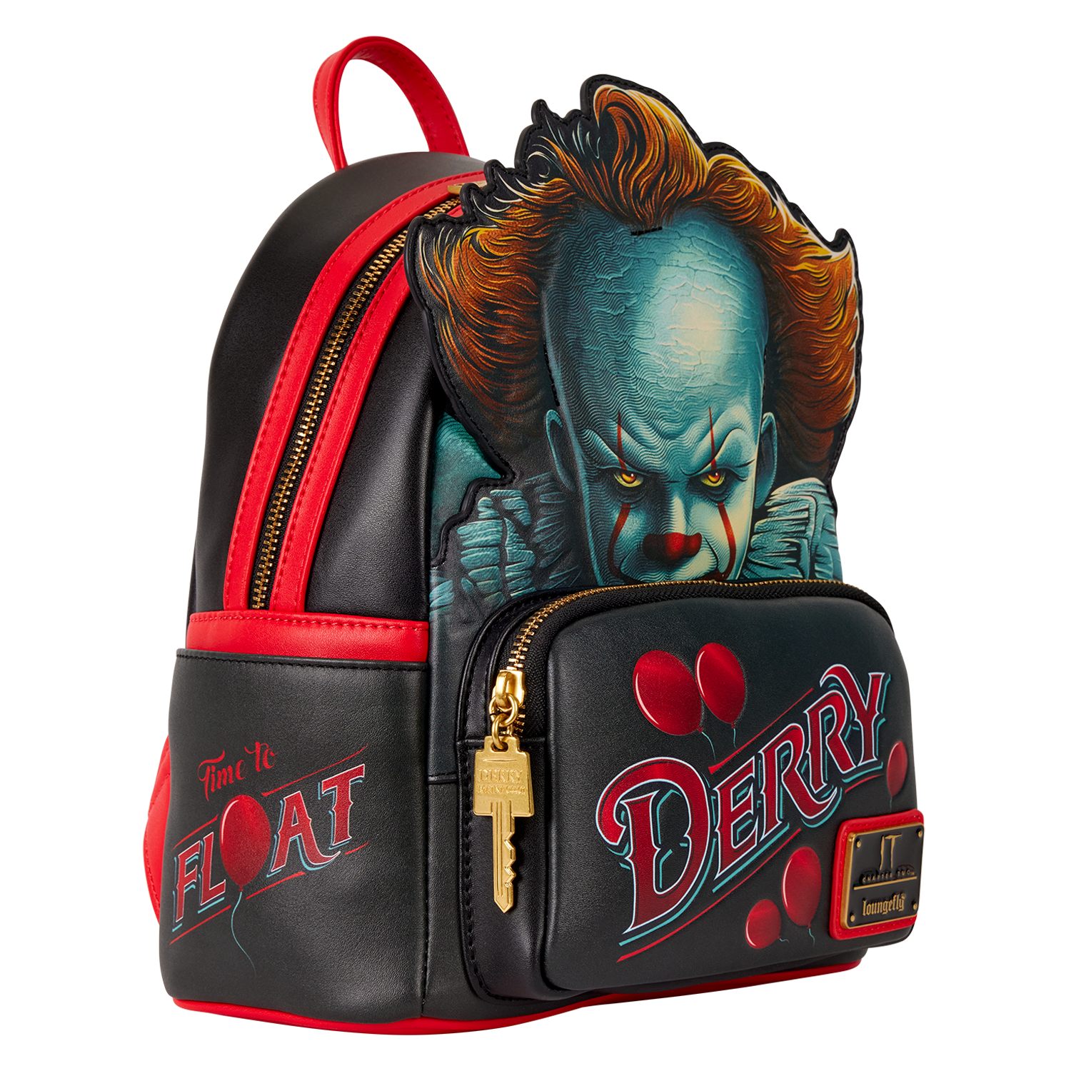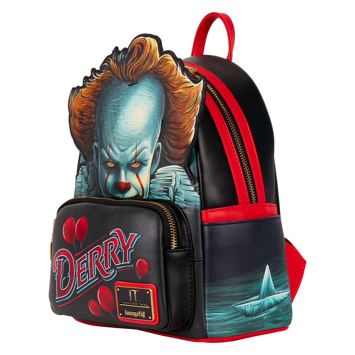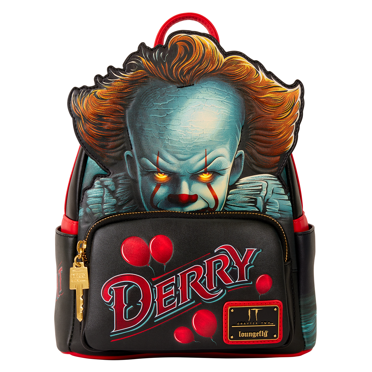 This mini backpack features your favorite shapeshifting dancing clown, Pennywise! He creeps over the front pocket, which says "DERRY." Pennywise's eyes light up for an extra scare. On the side pockets, you'll find an illustration of Georgie's boat and the phrase, "Time to Float."