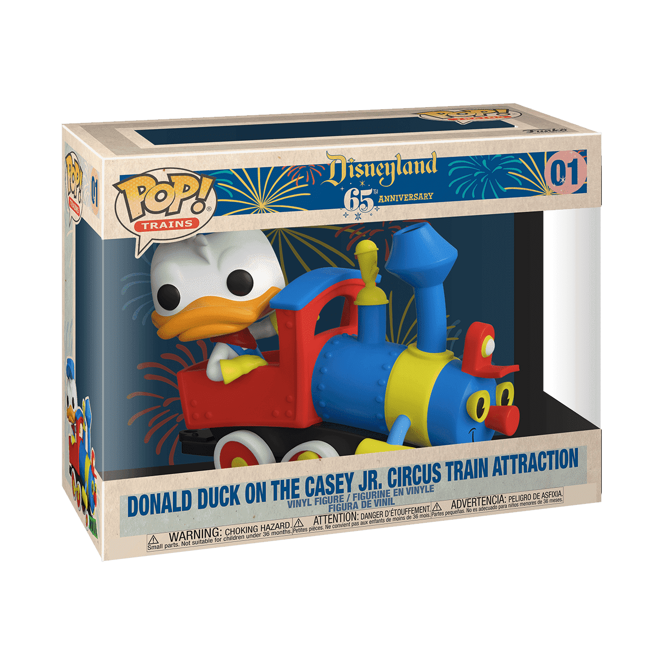 Similar to Pop! Rides these collectibles feature a themed train car and a Pop! figure which can stand inside the train car. Each car can be hooked together to complete a cohesive train display. Disney's 65th Anniversary set features a Pop! Train set which includes Pop! Train Donald Duck on the Casey Jr. Circus Train Attraction. There's also Pop! Train Zero in Duck Car and Pop! Train Hermione Granger with Hogwarts Express Car.