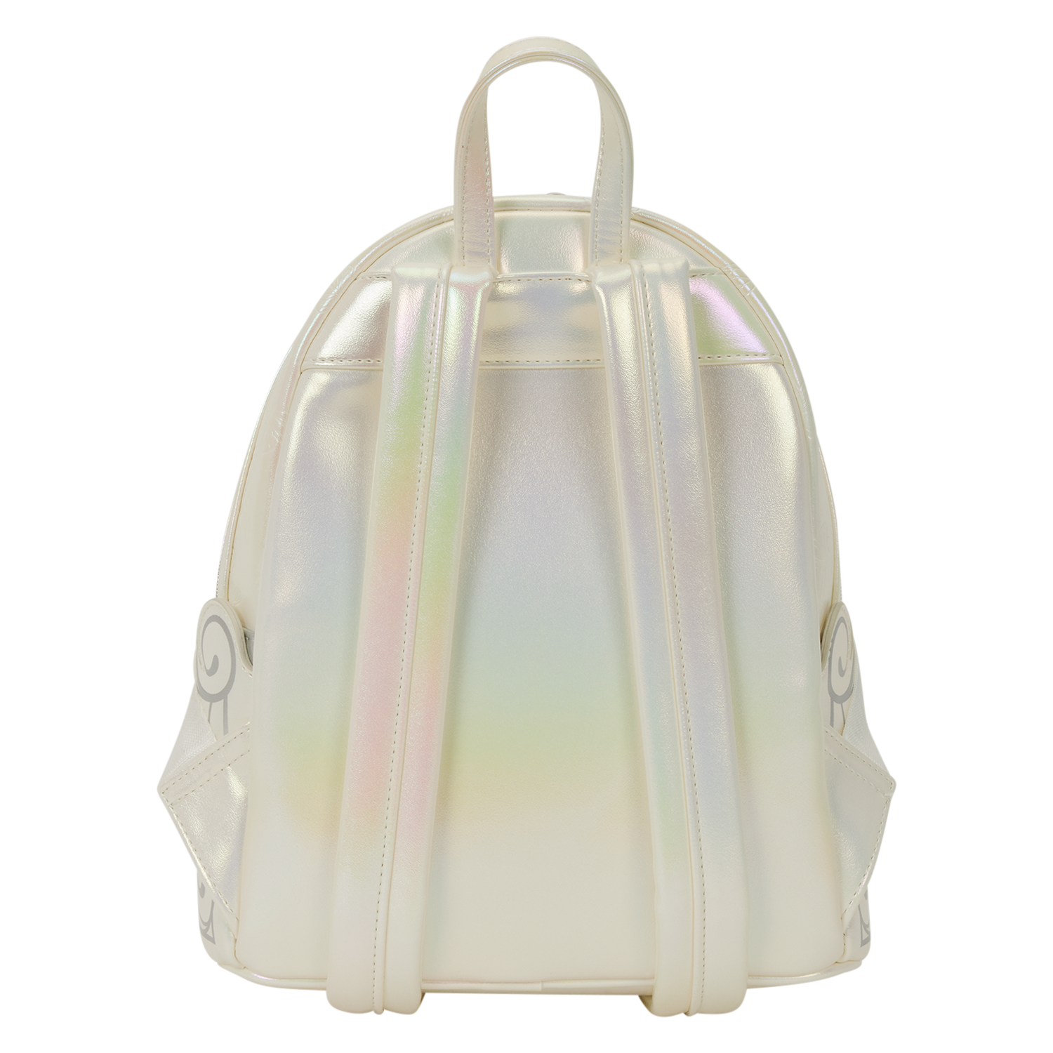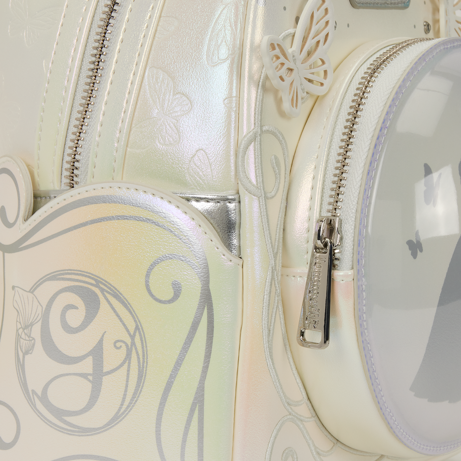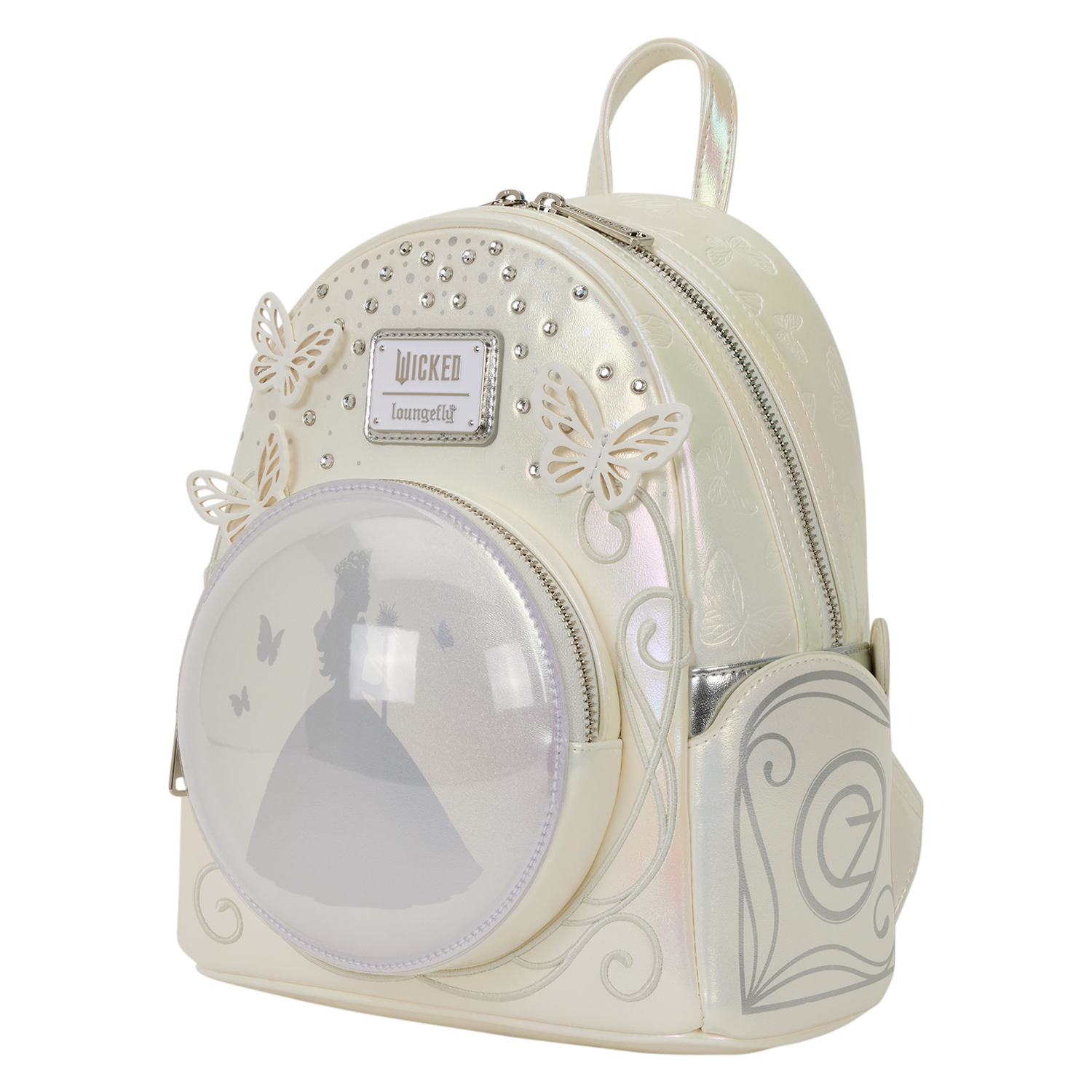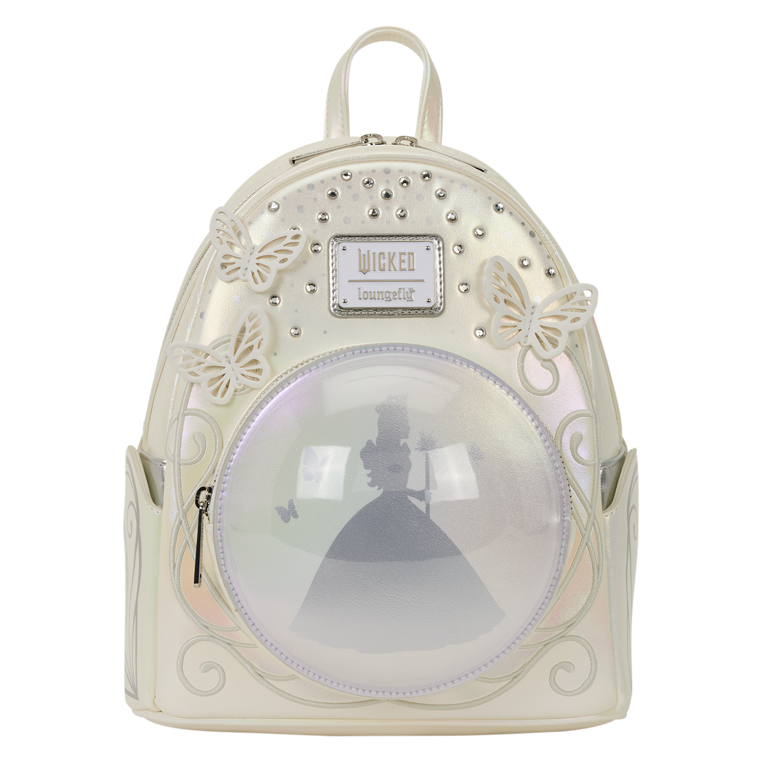 This gorgeous mini backpack features pearlescent faux leather with elegant details, including silver foil, rhinestones, and raised tonal embroidery. Over the front pocket, you'll find a clear PVC bubble with Glinda inside it! Butterflies and swirling designs cover the bag.